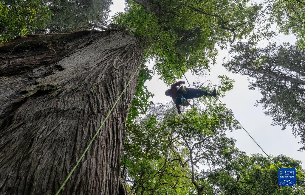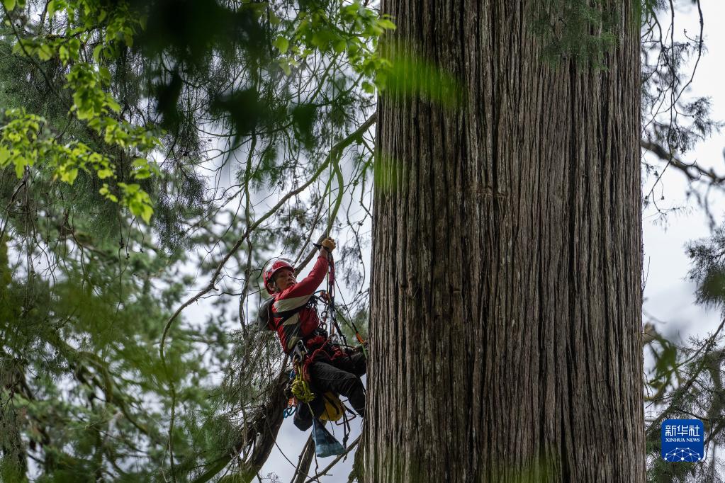 6月15日,攀樹專家劉團(tuán)璽在攀爬亞洲第一高樹。新華社記者 費(fèi)茂華 攝