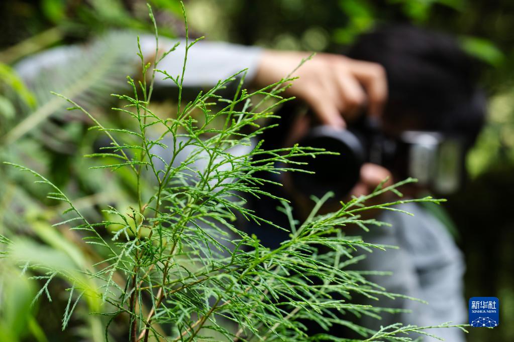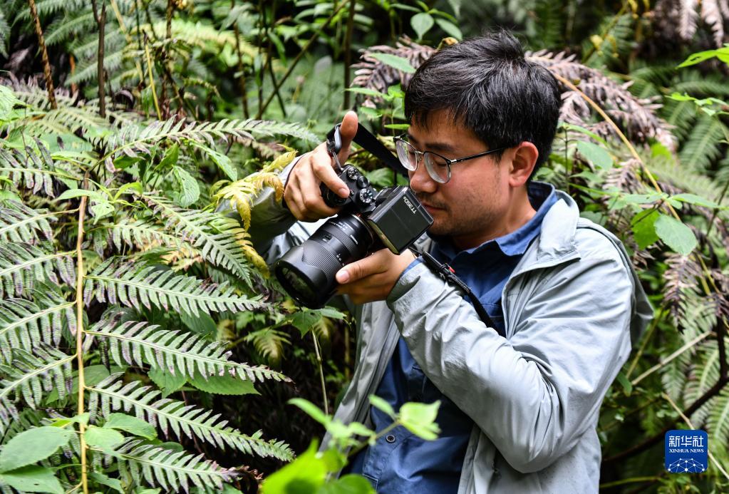 6月15日,中科院植物所博士生王孜在亞洲第一高樹旁拍攝一株西藏柏木的小樹苗。新華社記者 費(fèi)茂華 攝