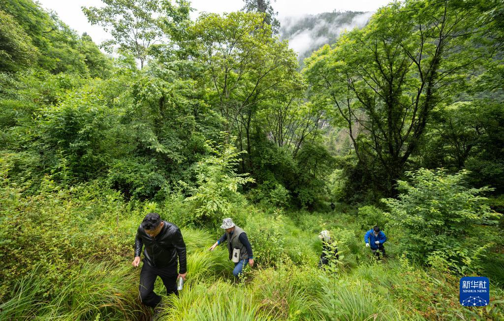 6月15日,波密縣林草局工作人員西繞(左)帶領(lǐng)大家穿過原始森林尋找亞洲第一高樹。新華社記者 費(fèi)茂華 攝