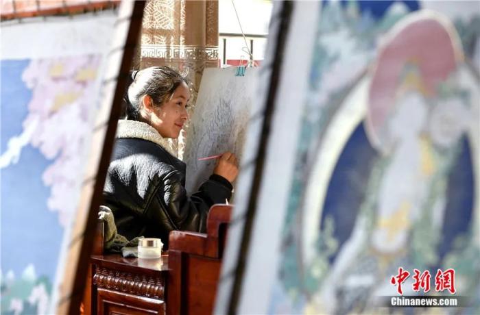 索朗次旺在西藏拉薩繪制唐卡。隨著社會的發(fā)展,越來越多的西藏女性學習唐卡繪畫。李林 攝