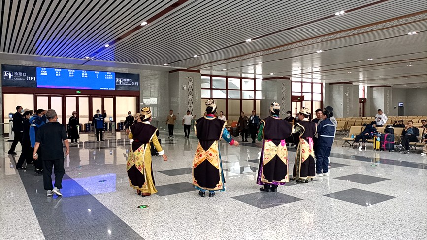 2023年6月25日,拉薩火車站、林芝火車站內(nèi)異常熱鬧。在拉薩火車站,準備乘坐C925次旅客列車前往林芝的旅客和車站“天路格?;ā狈贞牭墓ぷ魅藛T一起開展著競答互動小游戲,復興號列車紀念筆,車站卓瑪工作室卡通形象鑰匙扣、旅行雜志等小禮品受到旅客喜愛。在林芝火車站,工作人員和旅客跳起了熱情的鍋莊,他們用高原獨有的方式,慶祝拉林鐵路開通兩周年這個美好的日子。