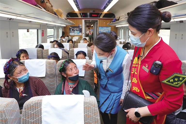 2022年初,青藏集團(tuán)有限公司在管內(nèi)各站、車開展“天路格?;ā逼放苿?chuàng)建以來,拉林鐵路各車站、各次列車上都能看到“天路格?;ā狈?wù)隊(duì)員,他們用真誠、熱情、熱心為每一位旅客提供溫馨細(xì)致的服務(wù)?!?月初,我?guī)е⒆觼砦鞑芈糜危?月20日前往林芝,游玩了三天,由于家里有事,不得不趕回去,就買了今天中午回拉薩的火車票,剛開車不久我姑娘就發(fā)燒,肚子痛。列車員看見孩子難受就詢問情況,并找來列車長周晶,通過廣播為我們找醫(yī)生,還好沒啥大事,就是腸胃感冒,我也就放心了。周晶車長也一直在旁邊幫我照顧孩子,拿濕毛巾擦臉,蓋毛毯,送來熱水,太細(xì)心了,讓我很感動(dòng)。她們工作認(rèn)真負(fù)責(zé),服務(wù)周到,我一路上都親身感受到了高原動(dòng)車的熱情。”在24日林芝到拉薩的C926次列車上,來自四川的高雅女士拉著記者激動(dòng)地說。