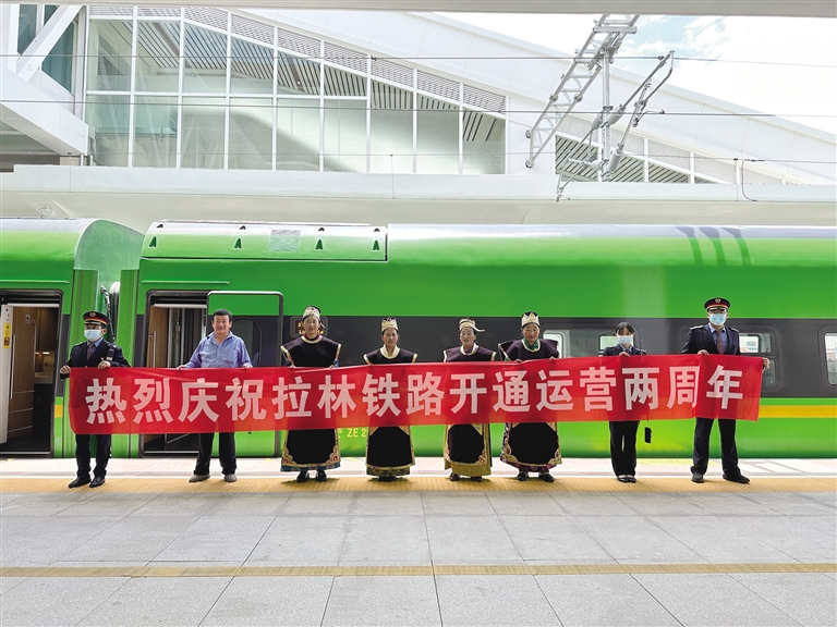 2021年6月25日,拉林鐵路開通運(yùn)營,結(jié)束了藏東南不通鐵路的歷史,復(fù)興號(hào)動(dòng)車開到西藏,駛上拉林鐵路,拉薩至山南、林芝最快1小時(shí)4分、3小時(shí)30分可達(dá);山南至林芝最快2小時(shí)22分可達(dá),相比汽車,從拉薩到林芝的時(shí)間幾乎節(jié)省了一半,從山南到林芝,也節(jié)省了2個(gè)多小時(shí)。兩年來,隨著運(yùn)行方式逐漸成熟,鐵路方便、快捷的運(yùn)輸優(yōu)勢(shì)逐步顯現(xiàn),客流持續(xù)攀升,青藏集團(tuán)有限公司及時(shí)根據(jù)客流情況在周末、節(jié)假日、寒暑假等客流高峰期增開281趟臨時(shí)旅客列車。兩年來,拉林鐵路共運(yùn)送旅客182.5萬人次,運(yùn)輸貨物41.91萬噸,拉近了藏東南地區(qū)9個(gè)城市的距離,也深刻改變了當(dāng)?shù)厝嗣竦墓ぷ骱蜕钣^念。