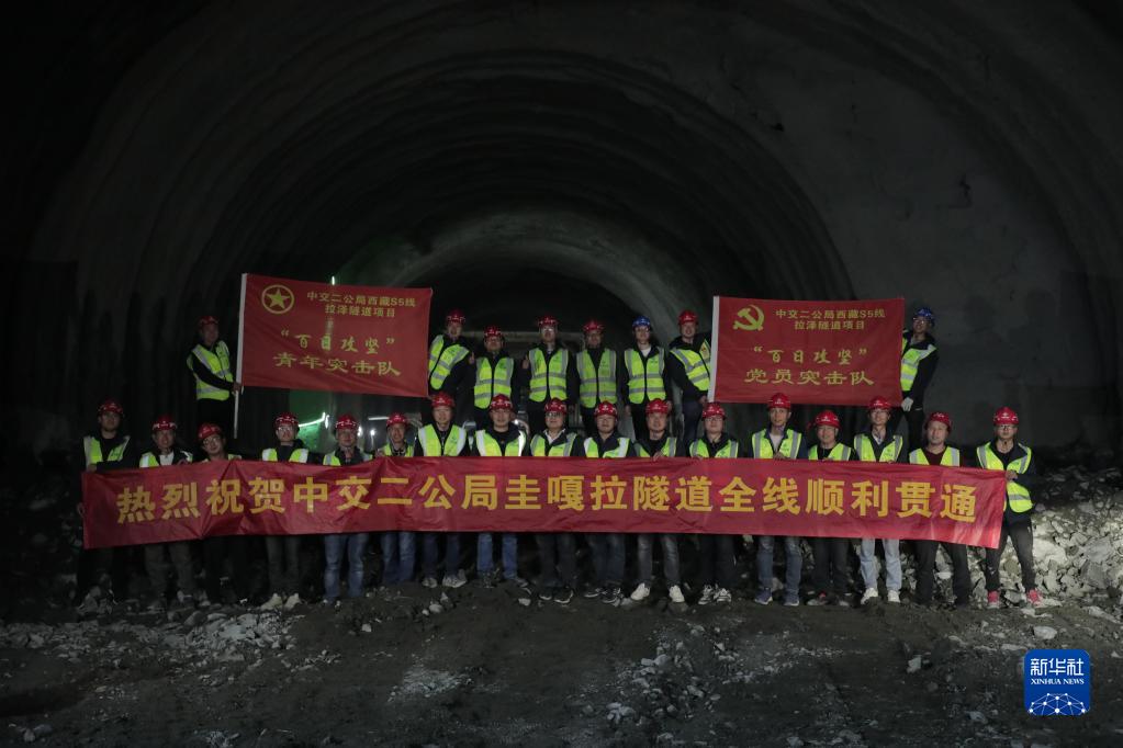 6月28日,施工人員在西藏S5線(xiàn)圭嘎拉隧道全線(xiàn)貫通后合影留念。新華社發(fā)(林夢(mèng)月 攝)