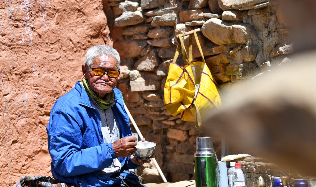 仁增旺扎老人在石窟旁的空地上吃午飯(5月26日攝)。新華社記者 晉美多吉 攝