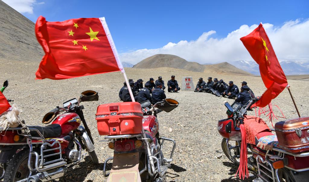 在33號界碑處,護邊隊在隊長石角(右二)的帶領下開展學習(6月2日攝)。新華社記者 晉美多吉 攝