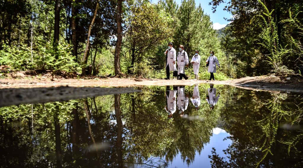 往返于村間的王振疆(左二)與隊員王彤旭(左一)、陳冰(右)及當?shù)蒯t(yī)生尼瑪益西(右二)(6月12日攝)。新華社記者 晉美多吉 攝