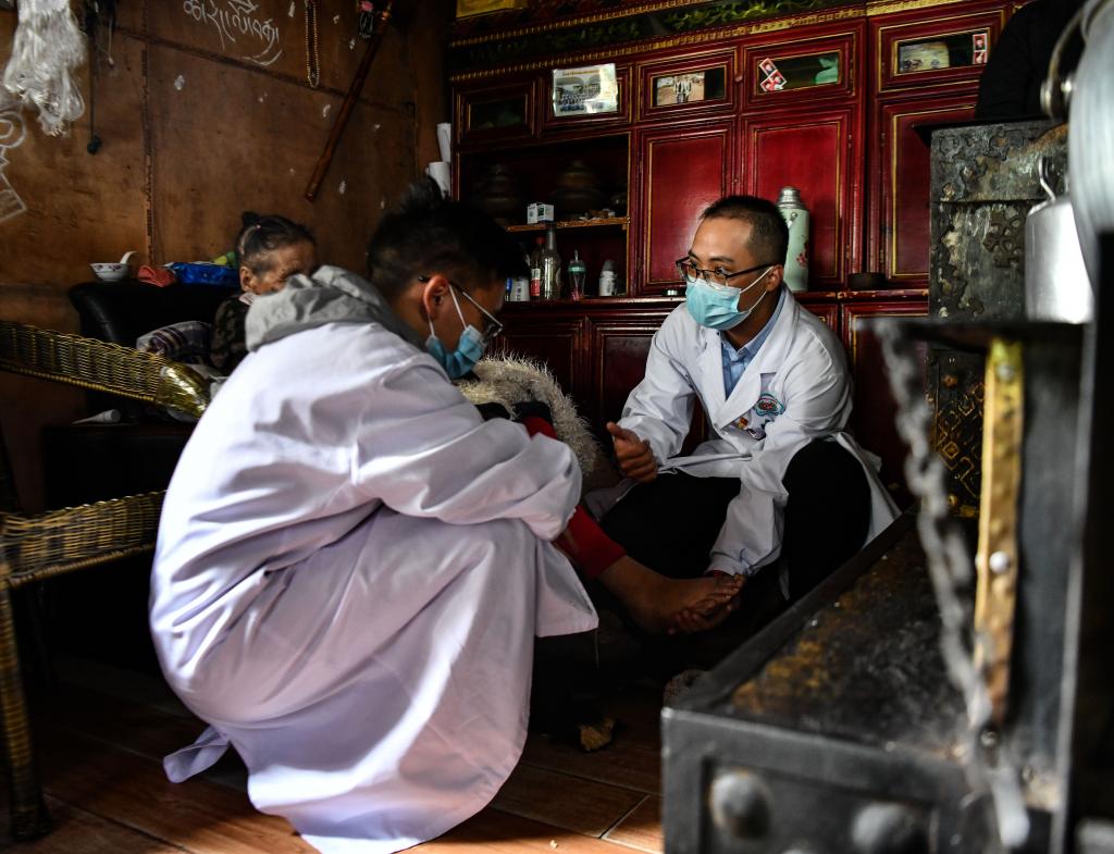 在米林的叢林中,珠海市人民醫(yī)院的援藏醫(yī)生王振疆手捧著病人的腳,仔細詢問病人的身體狀況,送去了援藏省市的關心,送去了藏漢一家親的問候。