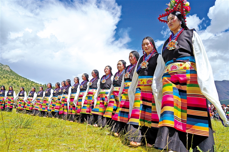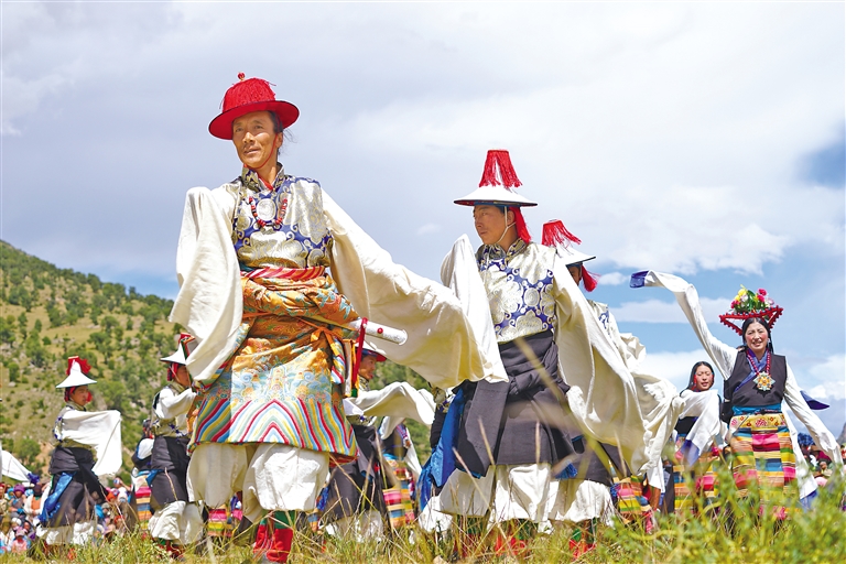 7月的林周縣唐古鄉(xiāng)綠草如茵,草地上點(diǎn)綴著藍(lán)色和黃色的野花。演員們以藍(lán)天白云為幕,伴隨著優(yōu)美的橫笛聲,跨出豪邁步伐,跳起了“熱振曲卓”?!盁嵴袂俊?,是林周人民智慧的結(jié)晶,在滄海桑田的變化中見證著這片土地的故事。