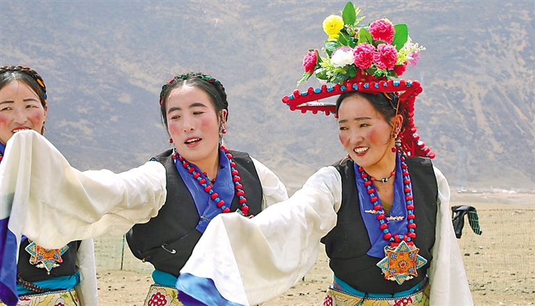 “熱振曲卓”文藝演出隊(duì)女演員表演舞蹈。