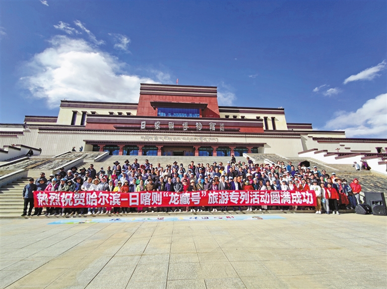 圖為從黑龍江省哈爾濱市乘坐2023年首趟“龍藏號(hào)”旅游專列的數(shù)百名游客順利抵達(dá)日喀則,并在日喀則博物館合影留念(6月2日攝)。記者 汪純 攝
