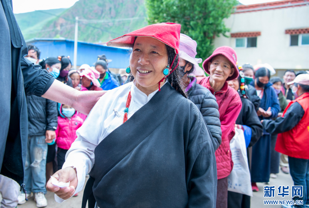 7月12日,群眾在西藏丁青縣西藏丁青縣尺犢鎮(zhèn)看完病后拿到組委會捐贈的藥品。新華網 旦增努布 攝