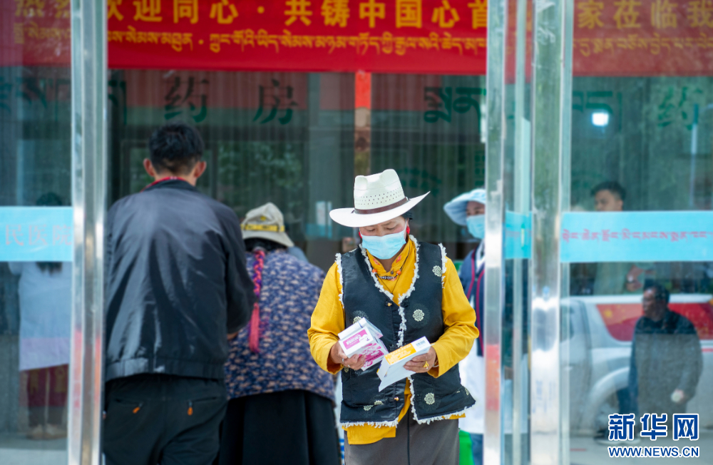 7月9日,群眾在西藏丁青縣人民醫(yī)院內看完病后拿到組委會捐贈的藥品。新華網 旦增努布 攝