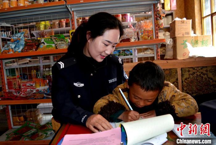 圖為索朗曲珍為轄區(qū)兒童輔導(dǎo)作業(yè)。勒布邊境派出所供圖