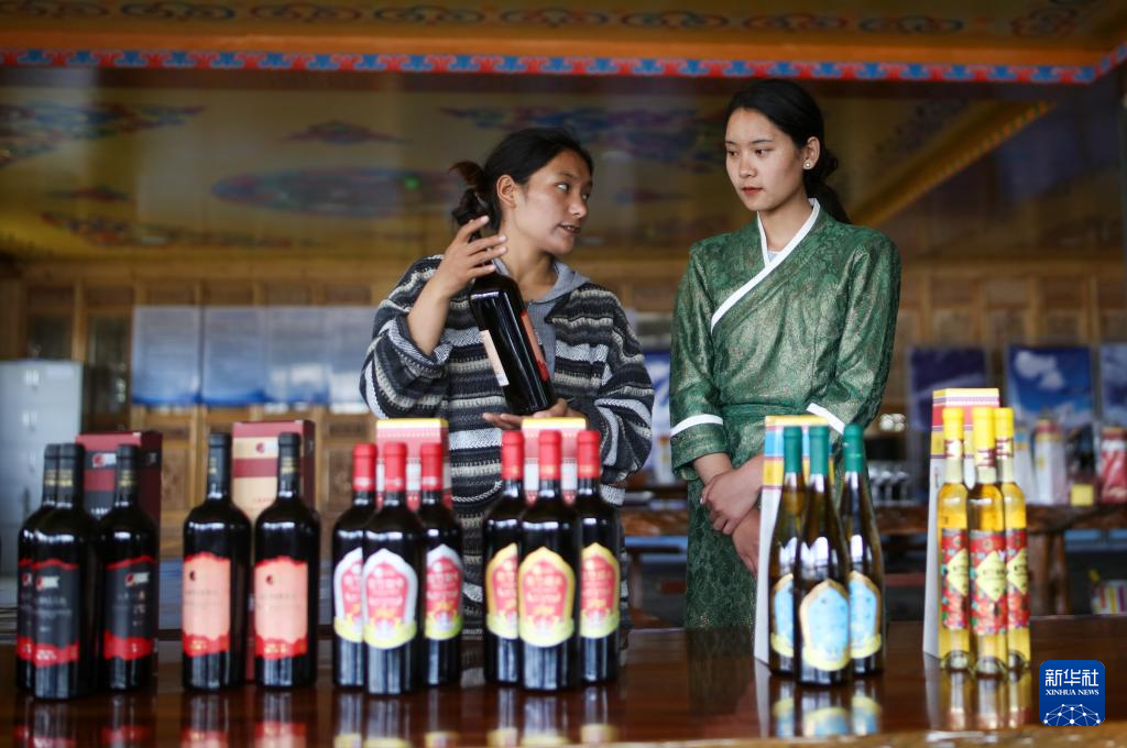 7月26日,桑日縣一家葡萄酒企業(yè)的員工曲珍(左)在跟同事一起練習企業(yè)葡萄酒產(chǎn)品介紹。新華社記者 旦增尼瑪曲珠 攝