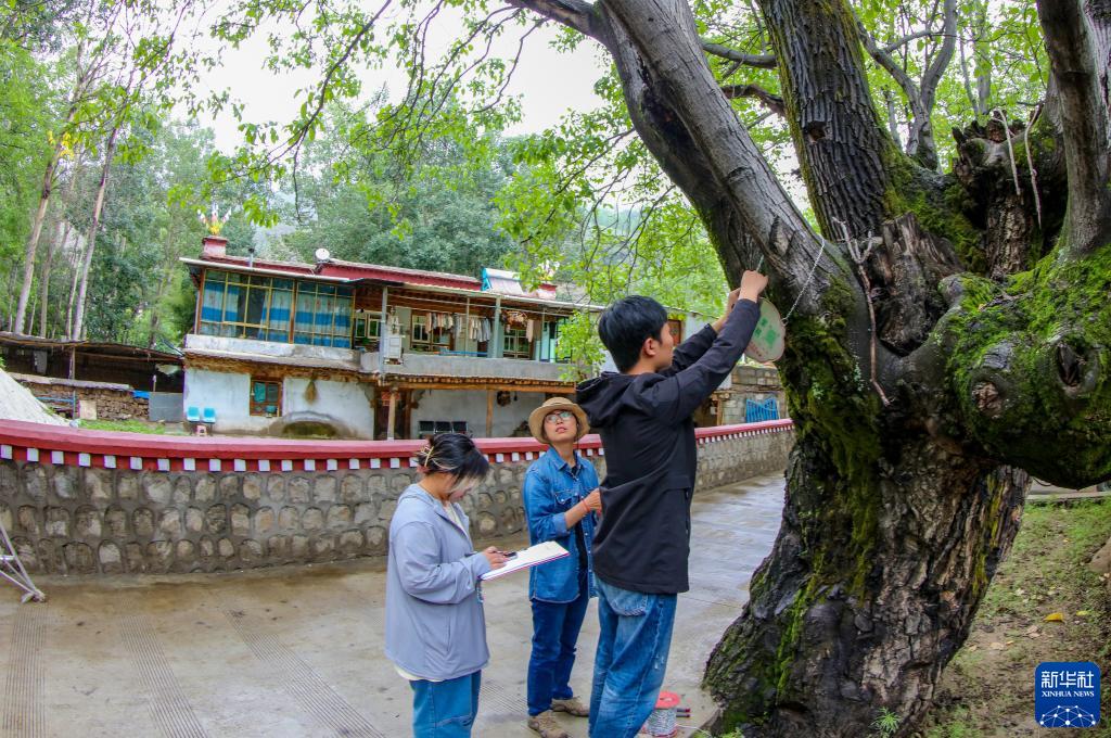 劉利平博士(中)在加查縣安繞鎮(zhèn)熱果村指導(dǎo)學(xué)生給一株古核桃樹(shù)掛牌(7月27日攝)。新華社記者 姜帆 攝