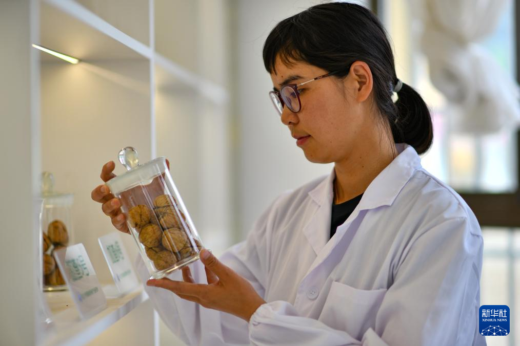 劉利平在長(zhǎng)江大學(xué)西藏高原核桃產(chǎn)業(yè)研究所檢查核桃果實(shí)標(biāo)本(7月27日攝)。新華社記者 旦增尼瑪曲珠 攝