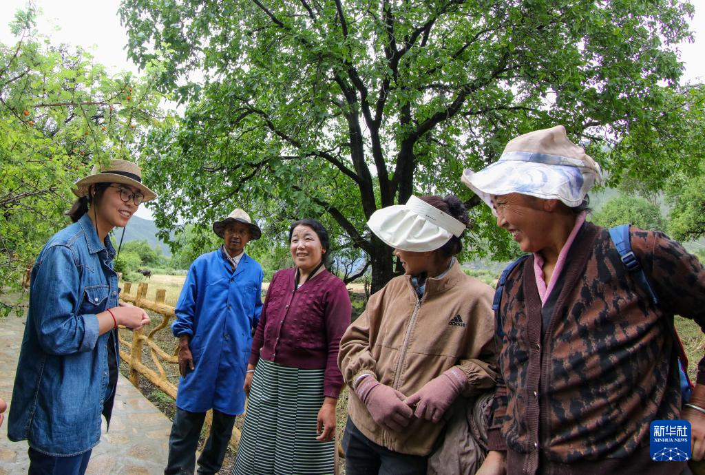 劉利平(左一)在加查縣安繞鎮(zhèn)熱果村與村民交流核桃樹養(yǎng)護(hù)技術(shù)(7月27日攝)。新華社記者 姜帆 攝
