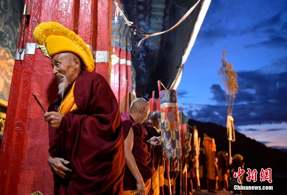 8月16日,拉薩哲蚌寺僧眾燃香為迎請?zhí)瓶ǖ年?duì)伍開道。