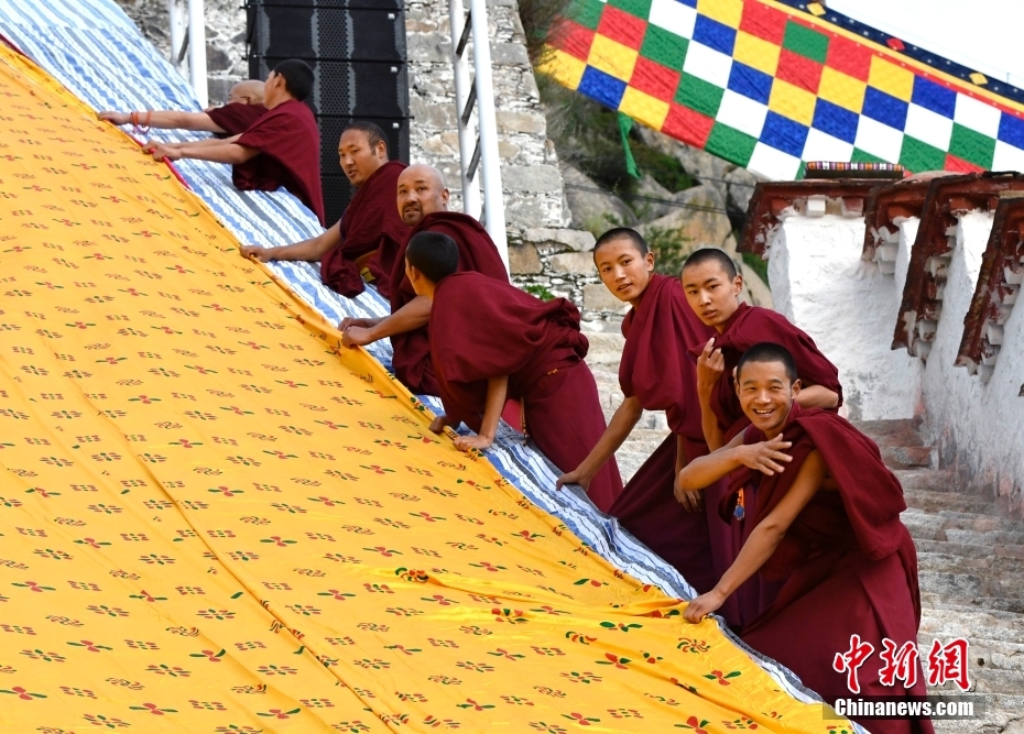 8月16日,哲蚌寺僧人們在展佛臺(tái)調(diào)整即將展出的巨幅唐卡。