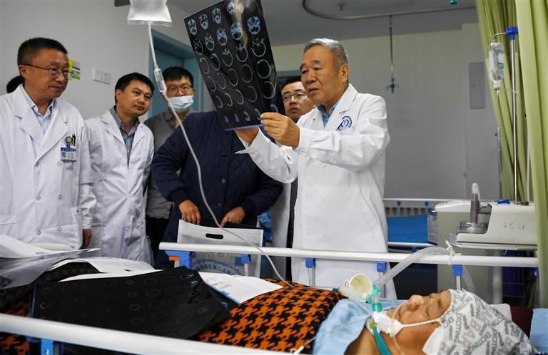 配圖:中國(guó)科學(xué)院院士、首都醫(yī)科大學(xué)附屬北京天壇醫(yī)院神經(jīng)外科學(xué)中心主任醫(yī)師趙繼宗(后右一)在自治區(qū)第二人民醫(yī)院為患者會(huì)診。 新華社記者 張汝鋒 攝