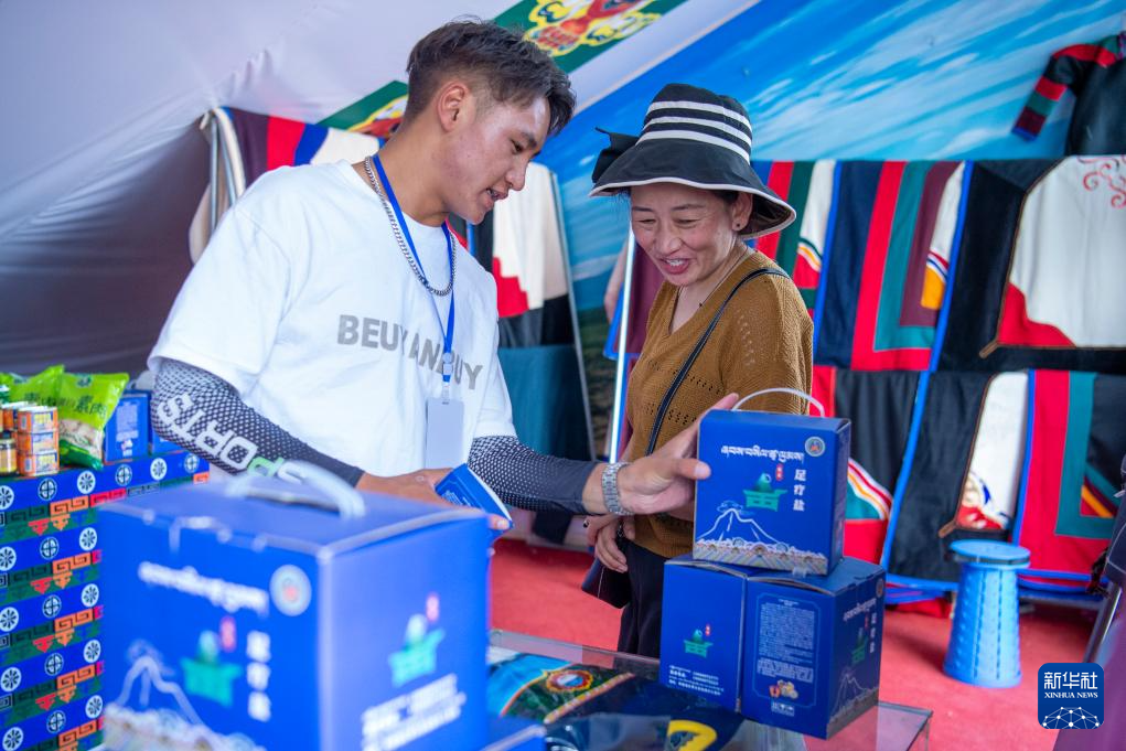 革吉縣鹽湖鄉(xiāng)羌麥村的村民旦真旺杰(左)在展銷會現(xiàn)場為顧客介紹產(chǎn)品(8月22日攝)。