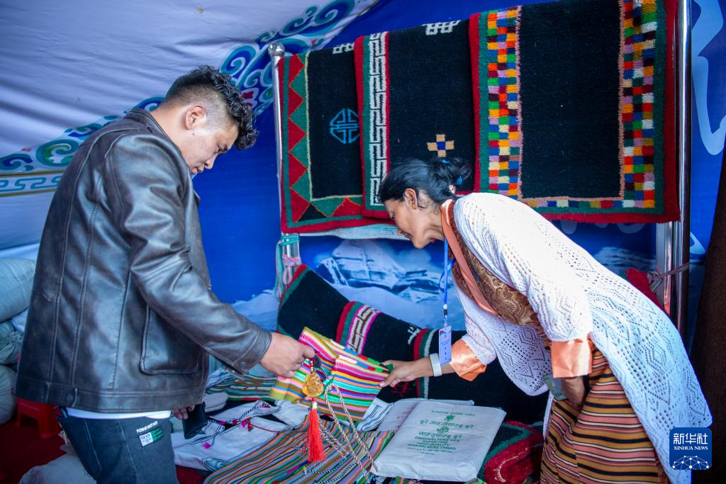 普蘭縣細(xì)德村的村民次仁卓瑪(右)在展銷會上向顧客介紹產(chǎn)品。