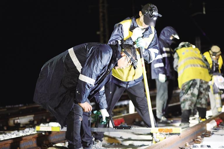 19時(shí)40分,施工負(fù)責(zé)人王占文組織車間職工準(zhǔn)備好工機(jī)具、材料,趕往現(xiàn)場(chǎng)。20時(shí)40分,隨著王占文一聲令下:“區(qū)間已經(jīng)封鎖,各專業(yè)(工務(wù)、電務(wù)、供電)可以上道作業(yè)”。大機(jī)作業(yè)車從桑日站緩緩駛出,迅速投入到“戰(zhàn)斗”中。