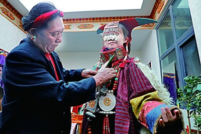 眾多的藝術(shù)形式當(dāng)然也會(huì)催生出絢爛多彩、雍容華貴的普蘭服飾,其中最有名的當(dāng)數(shù)普蘭“宣”服(又稱飛天服),單是穿戴這套服飾就要用一個(gè)多小時(shí)。地處貿(mào)易要道的普蘭人,將遙遠(yuǎn)的珊瑚、黃金、蜜蠟、白銀、綠松石、珍珠全都裝飾在“宣”服上,展示著對這襲錦袍的無比珍視。家族世代傳承“宣”服制作技藝的才旺多吉現(xiàn)在不僅把技藝公開傳授,每年單靠制作“宣”服,純收入就能達(dá)到四五萬元,而且通過普蘭的邊貿(mào)市場,這些服飾還能賣到尼泊爾和印度。