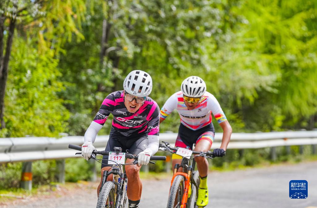 9月10日,北京GDR車隊選手黃世海(前)和亞車隊選手江村羅布在比賽中。最終,江村羅布和黃世海分獲男子組冠、亞軍。新華社發(fā)(劉劍璞 攝)