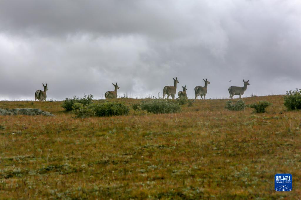 9月24日,幾只西藏馬鹿出現(xiàn)在位于西藏自治區(qū)山南市桑日縣的貢德林草原上。新華社記者 邵澤東 攝