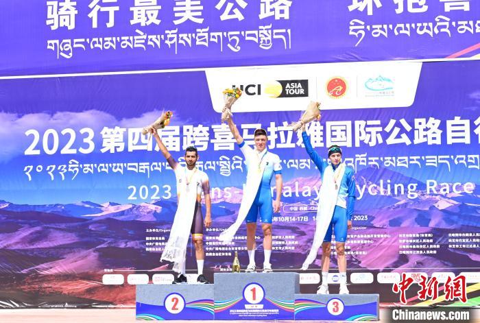 10月14日,第一賽段(林芝)前三名站上領獎臺。中新社記者 趙朗 攝