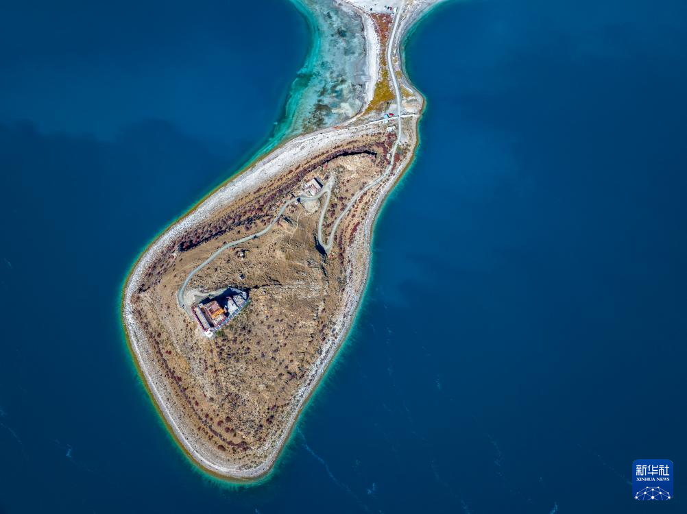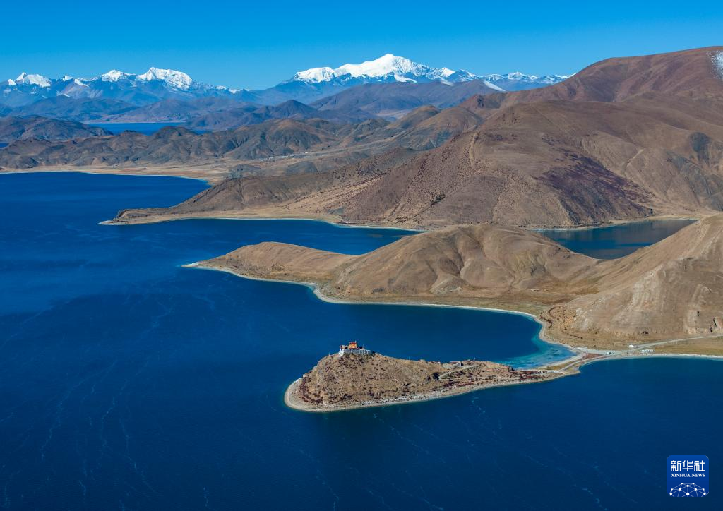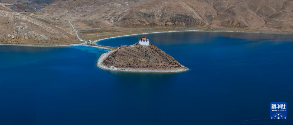 這是10月25日拍攝的羊卓雍錯(cuò)和日托寺(無人機(jī)照片)。新華社記者 姜帆 攝