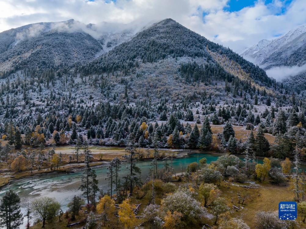 時(shí)值金秋,西藏林芝市秋色已濃,黃葉與初雪交織,流水并雪山輝映,景色如詩(shī)如畫(huà)。