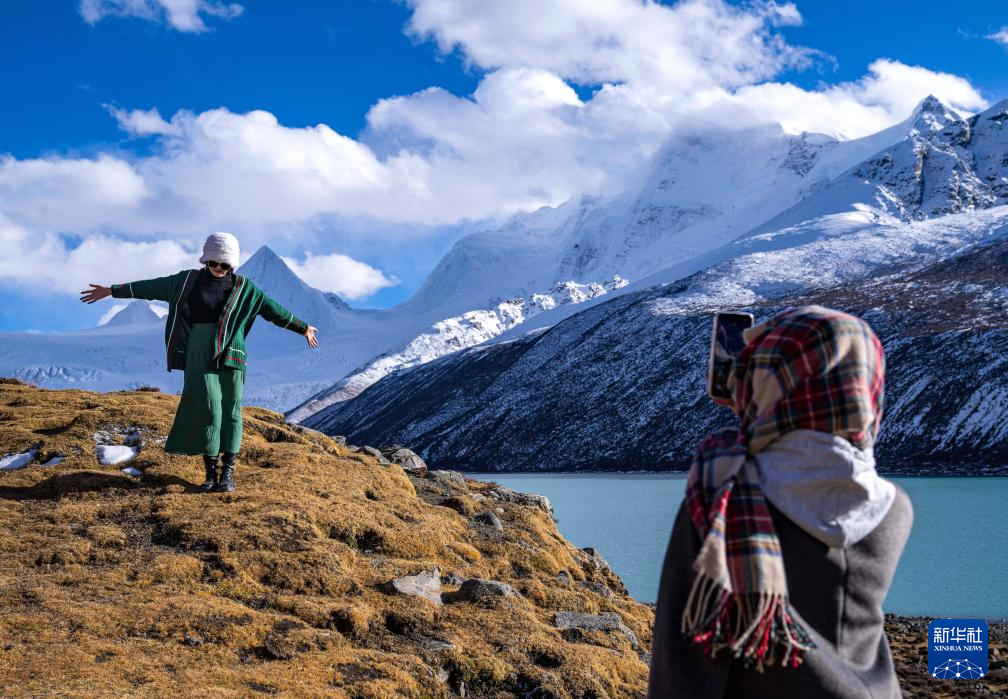 游客在薩普雪山腳下拍照留念(10月28日攝)。新華社記者 孫非 攝