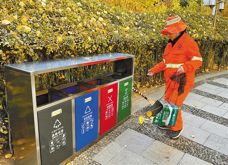 圖為環(huán)衛(wèi)工人在按照分類投放垃圾。記者 王敏 攝