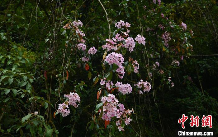 因氣候濕潤,森林里的樹上長滿了藤蔓植物、蕨類植物、苔蘚。在這里,植物從空間上獲得了最大密度的生長。開滿粉色花朵的植物從樹上倒掛而下,科考人員一眼辨認出是大花水東哥,奈何正是花期無法采集種子。