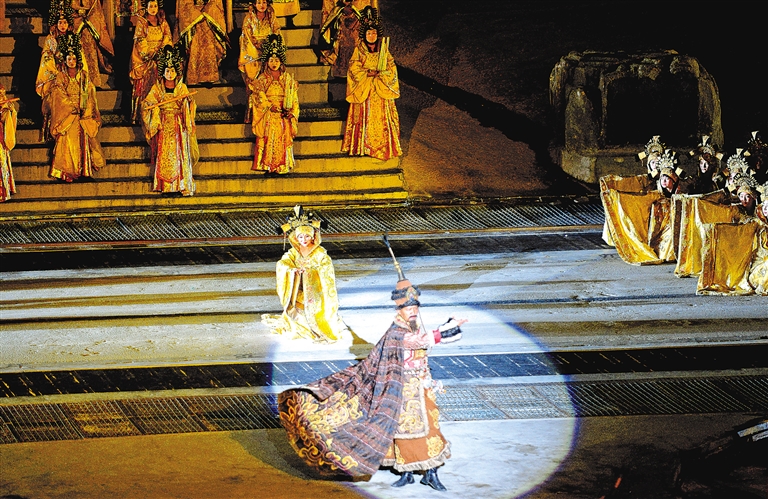星空為幕,山川為景,金碧輝煌的宮殿出現(xiàn)在群山之中,在燈光照耀下熠熠生輝。在悠揚(yáng)明朗的歌聲中,大劇拉開帷幕,藏族騎士自山中策馬而來,西風(fēng)漫卷、彩旗飄揚(yáng);少女們和著旋律,翩翩起舞,文成公主與松贊干布的佳話重現(xiàn)在舞臺(tái)之上。