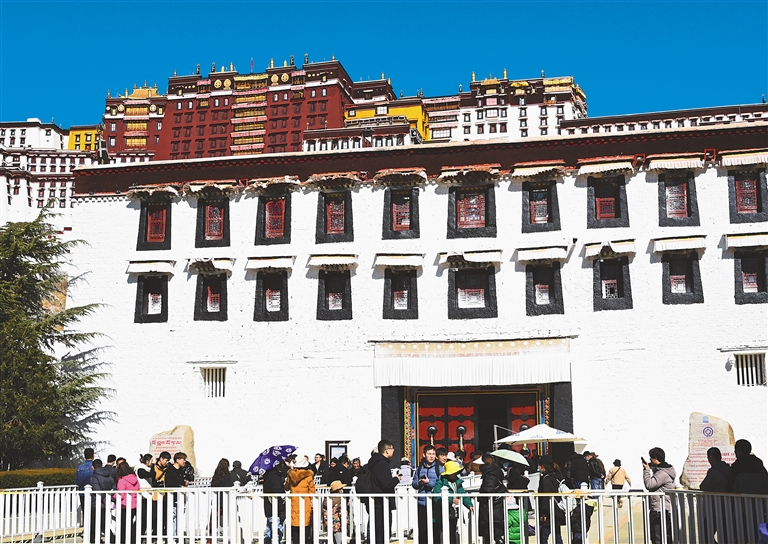 2023年11月1日至2024年3月15日為“冬游西藏”市場促進活動時間,在此期間,除寺廟景區(qū)外,西藏自治區(qū)所有A級景區(qū)免費游覽?;顒訂右詠恚歼_拉宮作為游客來藏旅游的首選之地,日均接待量達4000余人次?!?/p>