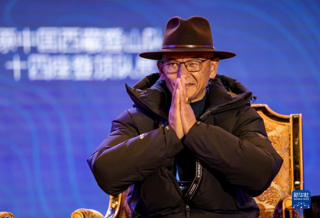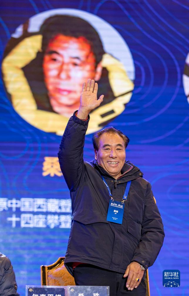 12月11日,原西藏登山隊(duì)登頂世界十四座海拔8000米以上高峰探險(xiǎn)隊(duì)隊(duì)長(zhǎng)桑珠在交流大會(huì)上向觀眾致意。新華社記者 姜帆 攝