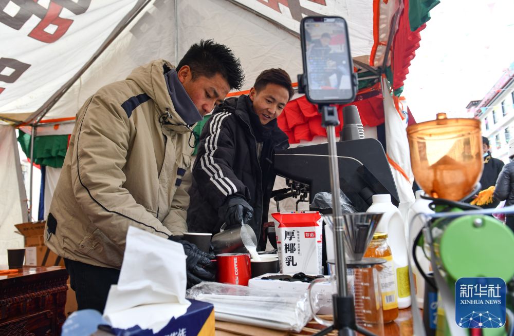 12月13日,西藏日喀則康馬縣冬季物資交流會(huì)上,幾名大學(xué)生在銷售現(xiàn)磨咖啡,并同步進(jìn)行網(wǎng)絡(luò)直播。