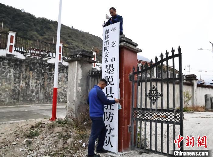 圖為林芝市森林消防支隊為墨脫縣駐防分隊懸掛牌匾。趙建宇 攝