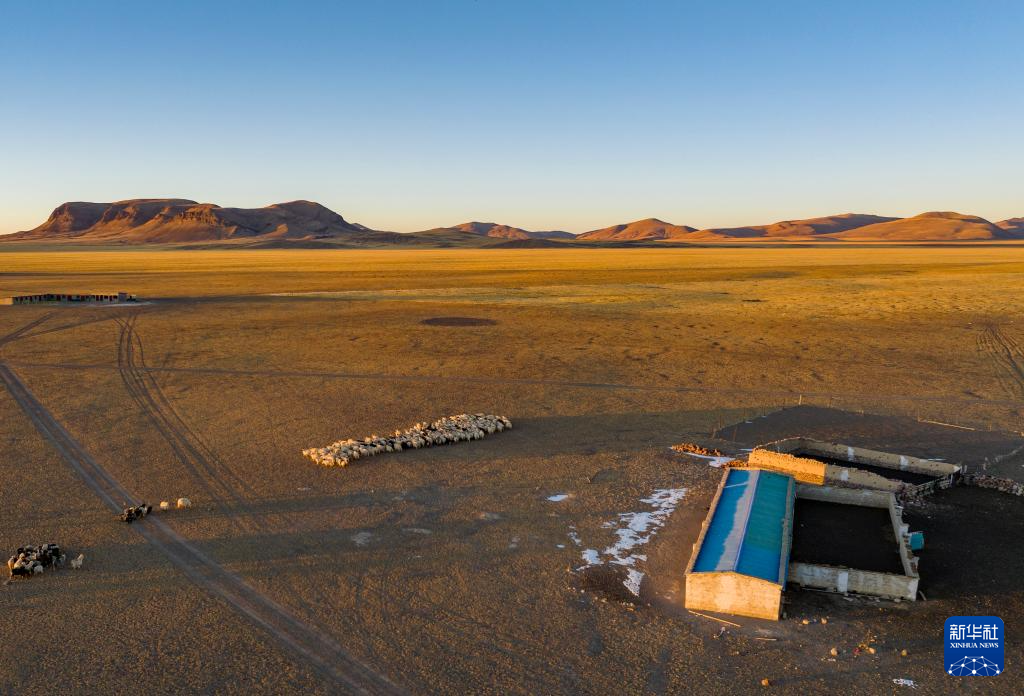 太陽落山,丹增家的羊回到棚圈。其中左側(cè)藍(lán)頂?shù)氖侨ツ晷律w的封閉式棚圈,右側(cè)是傳統(tǒng)的敞開式羊圈(無人機(jī)照片,12月18日攝)。新華社記者 姜帆 攝