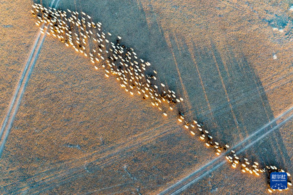 太陽落山,丹增家的羊從草場趕回棚圈(無人機(jī)照片,12月18日攝)。新華社發(fā)(旦增努布攝)