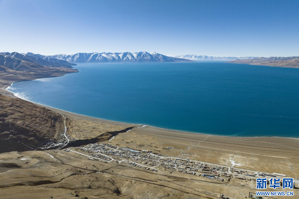 12月20日拍攝的當(dāng)惹雍錯(cuò)和村莊(無人機(jī)照片)。新華網(wǎng) 旦增努布 攝