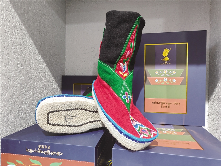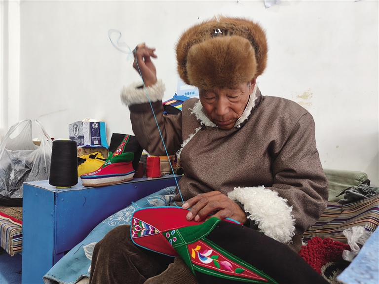 “藏靴樣式精美、花色靚麗,因材質(zhì)和花色的不同分為‘郭扎’‘郭朵’‘松巴’三種?!枪?jié)慶時(shí)穿,‘郭朵’‘松巴’可以日常穿,制作一雙藏靴需要一周左右的時(shí)間。這些藏靴不分左右,磨損后可以互換,還可以防潮防寒。”正在縫制藏靴的索朗頓珠雙手稍顯粗糲卻不失靈巧,他邊飛針走線,邊給記者介紹著手中的藏靴。厚而輕的鞋底、柔軟的靴面,五顏六色的絲線繡出栩栩如生的多瓣蓮花,加上氆氌制成的鞋面,一雙極具民族特色的藏靴展現(xiàn)在眼前。
