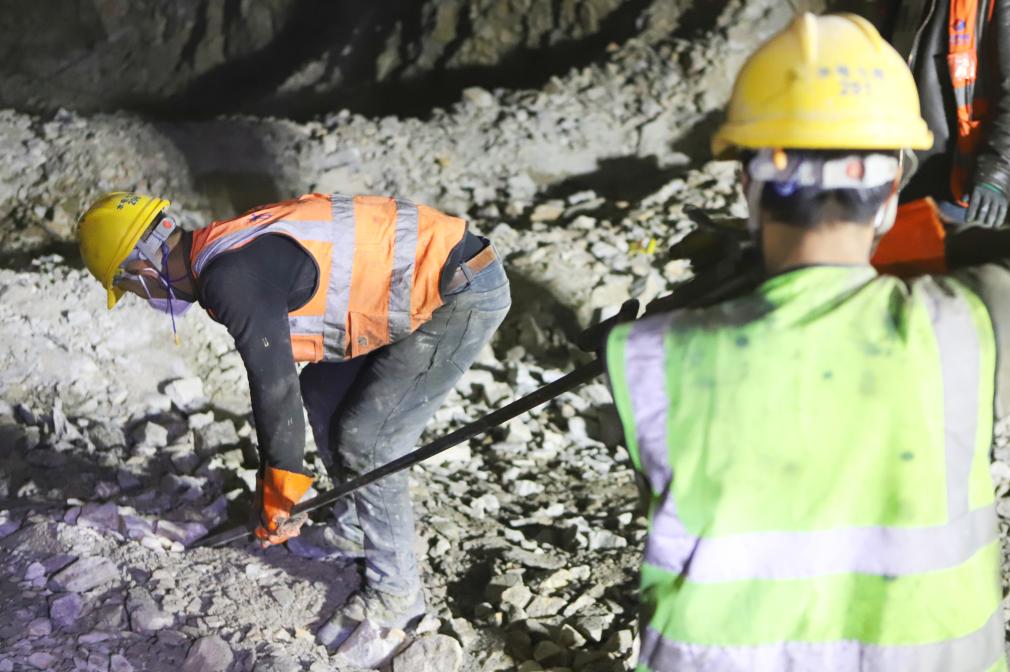 工人在引水隧洞內(nèi)鉆孔,準備爆破。新華社記者關(guān)明輝 攝