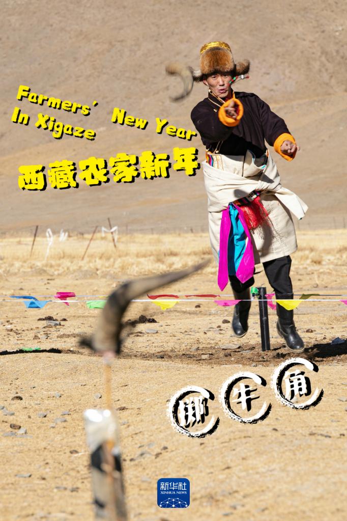 日喀則市白朗縣東喜鄉(xiāng)思古龍村村民正在投擲牛角,擊中牛角寓意新的一年里六畜興旺(1月13日攝)。