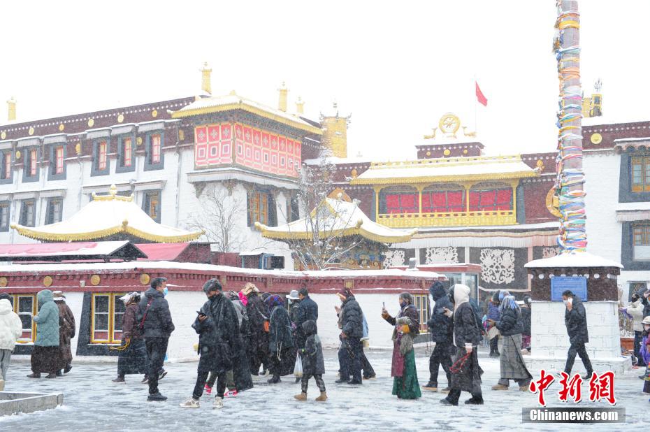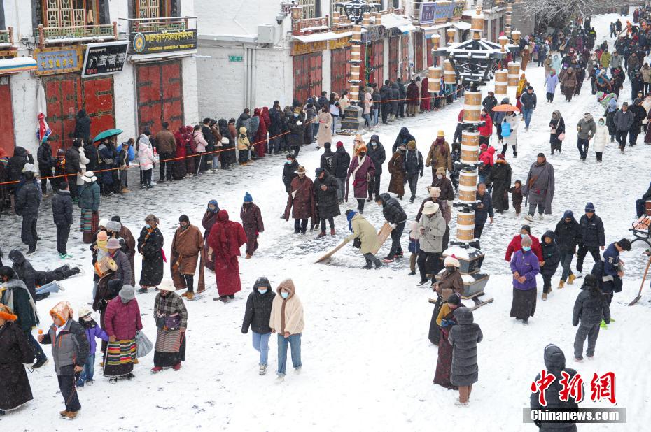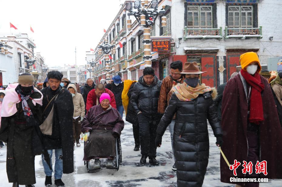 1月18日,西藏拉薩迎來一場大雪,雪后信眾在八廓街轉(zhuǎn)經(jīng)出行。布達拉宮銀裝素裹,分外美麗。圖為雪后信眾轉(zhuǎn)經(jīng)出行。