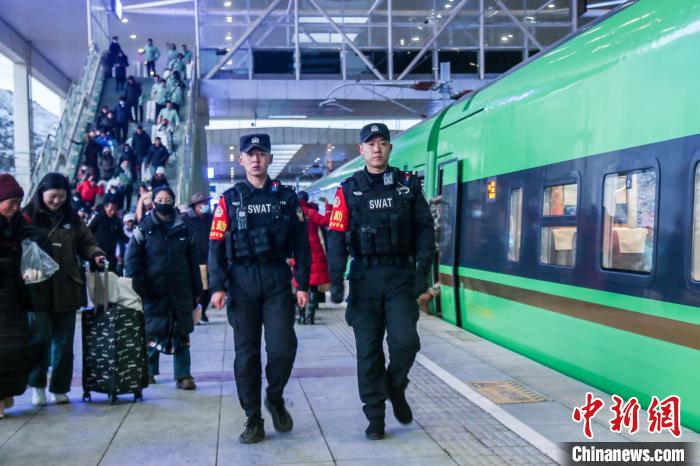 圖為春運(yùn)首日,拉薩鐵路公安處特警巡查即將發(fā)送的列車。王興楠 攝